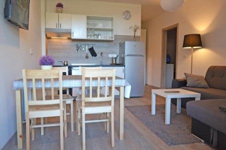 Ponujamo vam bivanje v polno opremljenem apartmaju s tremi spalnicami. V apartmaju lahko prenoči 6 oseb, dodatni dve osebi pa lahko prenočita na sedežni garnituri. Bujen vrt ponuja veliko prostora tako za otroke, kot za odrasle.