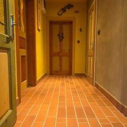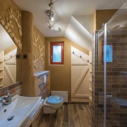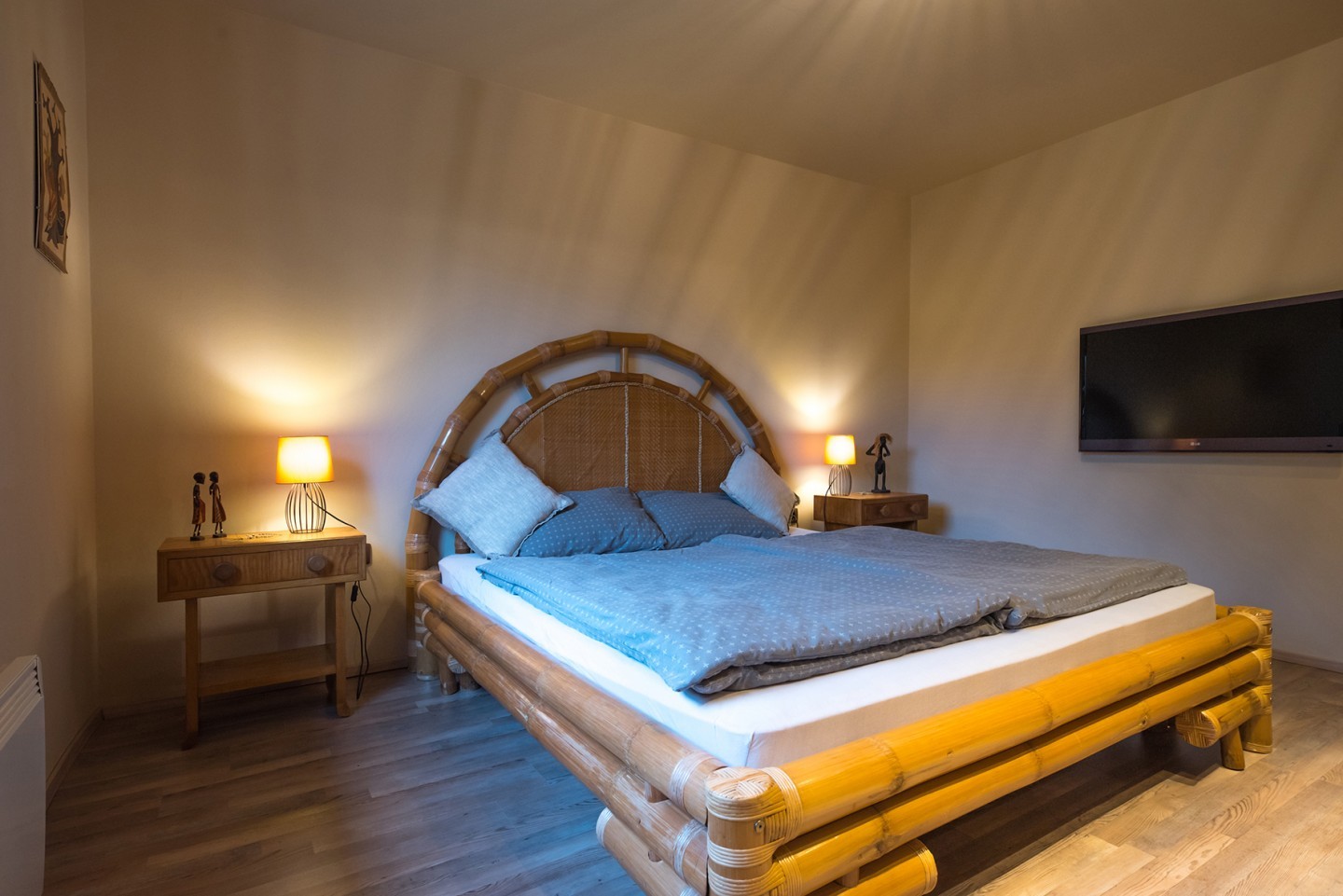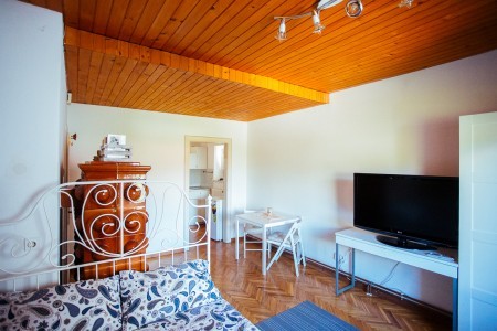 Apartma se nahaja v pritličju, ima lasten vhod in meri 55 m2. V apartmaju je kopalnica s tušem, dve spalnici, ena z zakonsko posteljo in televizijo ter ena s tremi ležišči (pograd in vzmetnica). Jedilnica se nahaja v kuhinji (polno opremljena s mikrovalovno pečico, toasterjem,…).