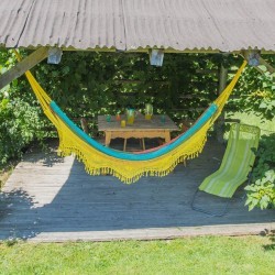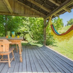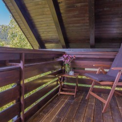 Primerno za 6 oseb, to je naš največji apartma. Tri kraljeve postelje, ena v spodnjem nadstropju in dve nad dnevno sobo. Izjemno velika kuhinja z velikim hladilnikom, pomivalnim strojem, mikrovalovno pečico in pečico. Vsaka soba je s posamično klimatsko napravo. Velika TV z ravnim zaslonom z več kot 100 kanali. Zasebna kopalnica in WC imajo individualne vhode. Velik balkon s pogledom na polja in hribe okoli hiše.