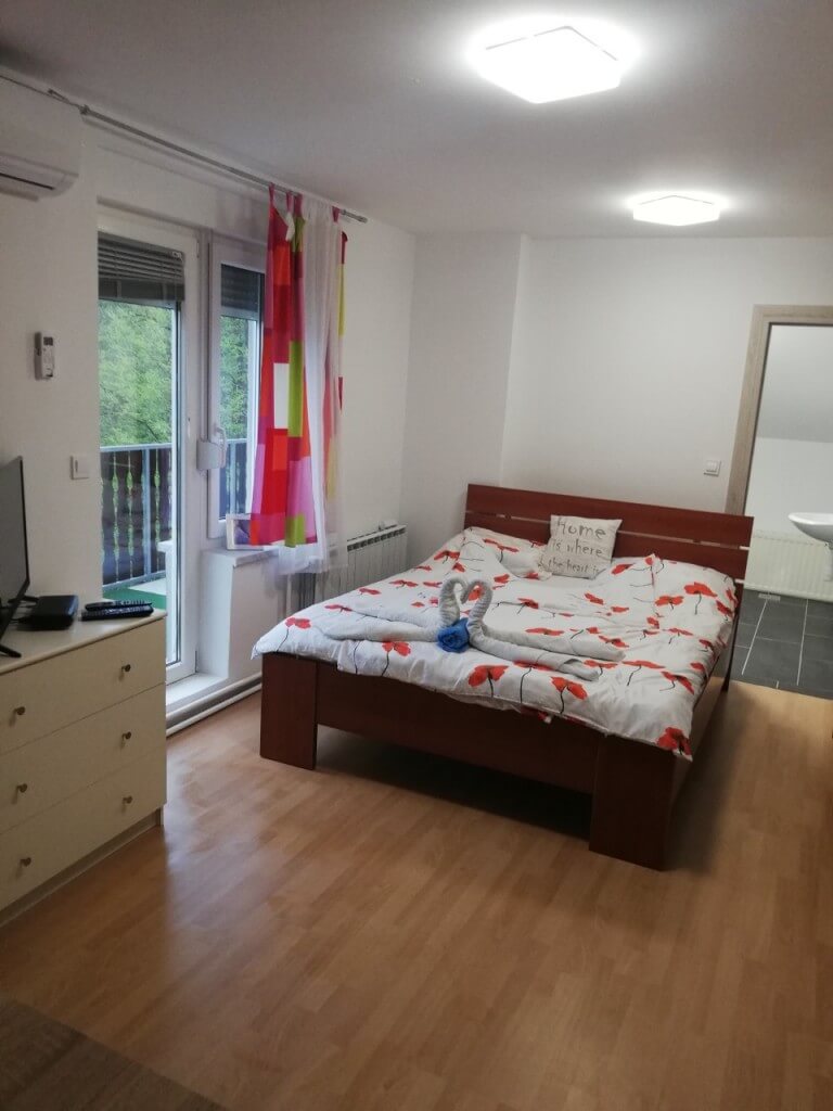 V apartmaju so najnujnejše potrebščine za preživeti par dni v objemu narave obdane z goricami, na katere je pogled tudi iz apartmaja.Kraj je primeren za sprehode, sprostitev…Vsaka soba ima klimo, kopalnico, tv,mini kuhalnik, balkon…