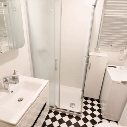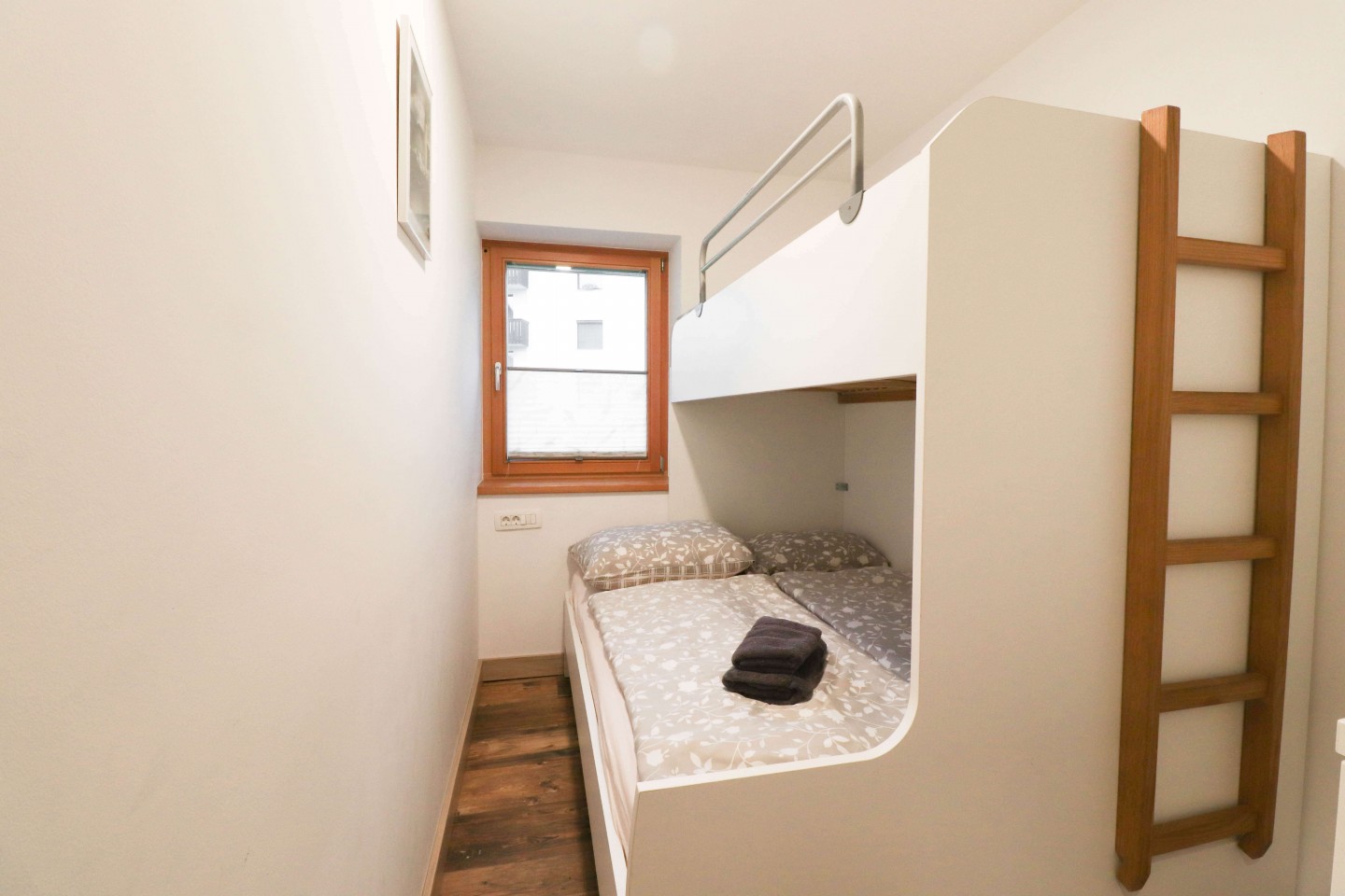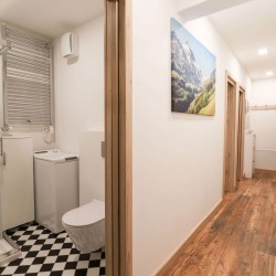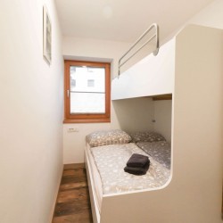 Kopalnica je s tušem in pralnim strojem. Dve spalnici ena z zakonsko posteljo (140 x 200cm) in druga s tremi ležišči (eno 140 x 200cm in drugo 90 x 200cm).