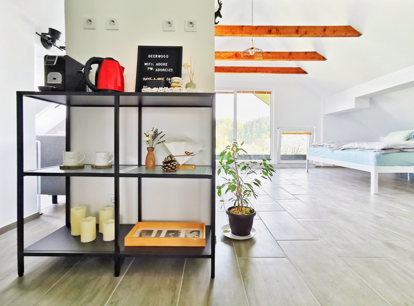 Penthouse Deerwood Sky se nahaja na popolni lokaciji 500 metrov od Blejskega gradu, le 5–10 minut hoje do središča Bleda (z restavracijami in bari) in 10-15 minut hoje do Blejskega jezera, vendar je stanovanje tudi stran gneča in lahko uživate v čudovitem pogledu na grad z gorovja Alp, včasih lahko na vrtu celo vidite divje jelene, ki jedo travo! Penthouse je popolnoma nov sodoben, prijeten, a naraven kraj za bivanje.