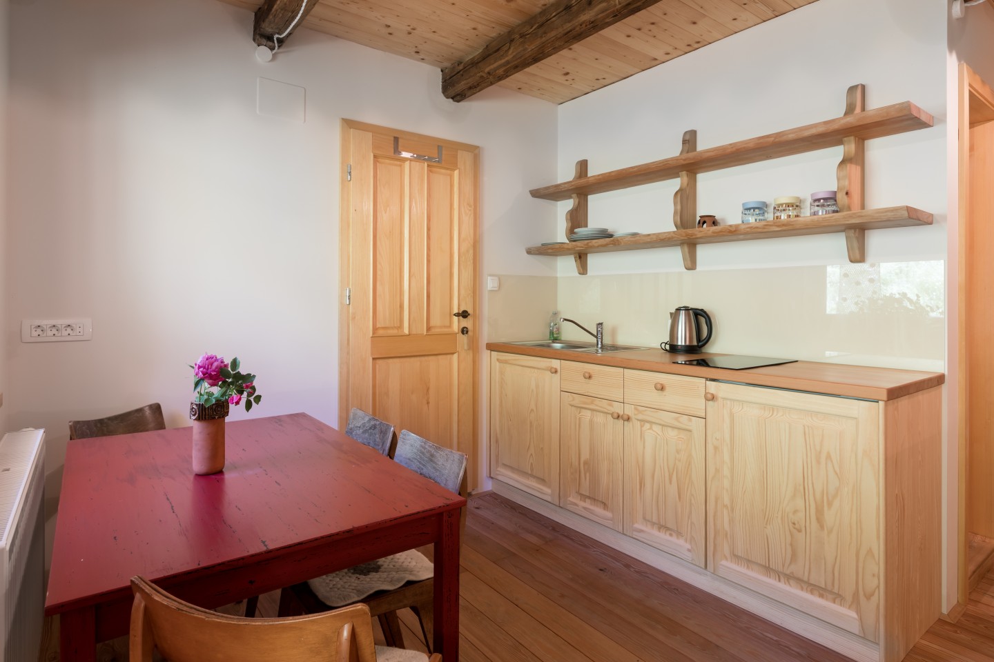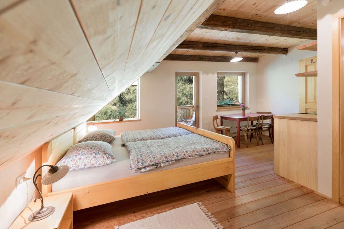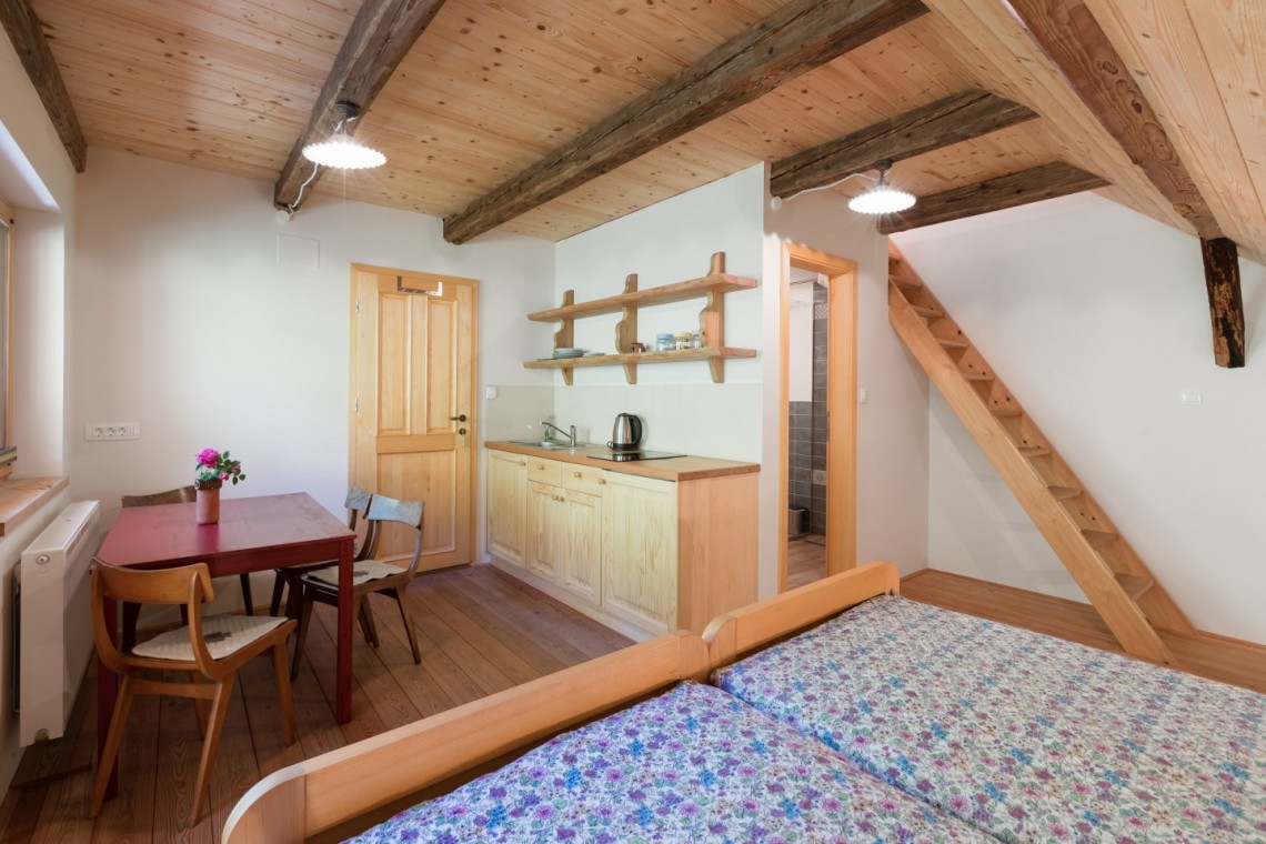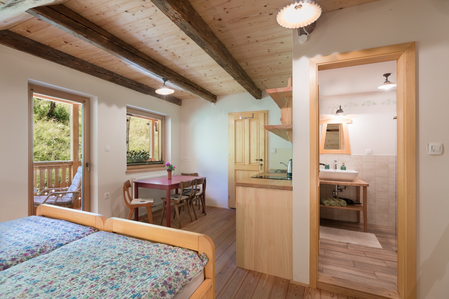 Apartma Bazilika je duplex apartma v dveh nadstropjih. Ima privatno kopalnico, kuhinjo, jedilno mizo in izhod na svoj balkon. Domačijo obdaja travnik, vrt in gozd, kjer lahko najdete mnogo kotičkov za odmor, piknik, branje knjige ali igro.