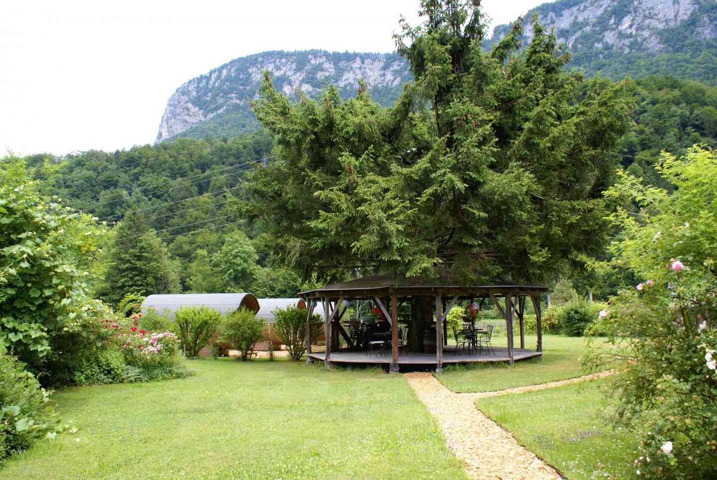 – LOKACIJA: Glamping se nahaja na idilični lokaciji v dolini med Pokljuko in Jelovico, ob bregu reke Save Bohinjke. Do Blejskega jezera je 5 min vožnje, do Bohinjskega jezera pa 18 min. Zemljišče obdaja Sava Bohinjka (manjša prodnata plaža je oddaljena 10 min hoje). V bližini je avtobusna postaja (80m od nastanitve) z dobrimi povezavami smer Bled-Bohinj. Žel.postaja se nahaja 1.5 km stran (Bohinjska Bela).