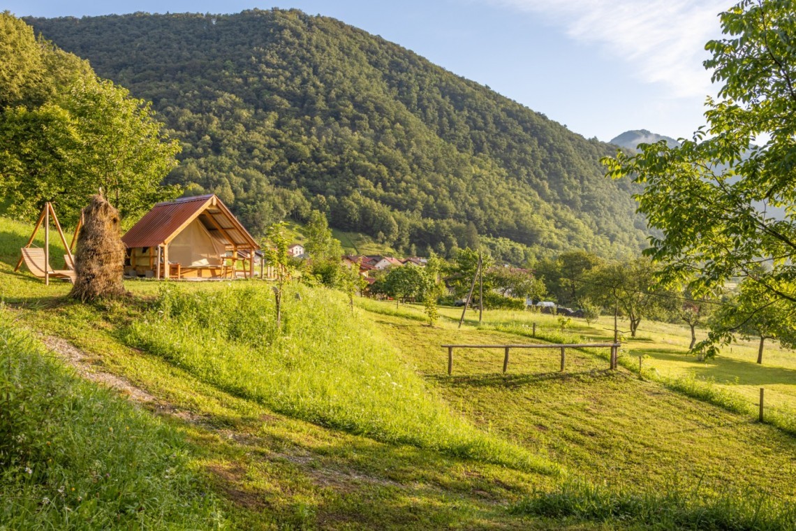 Nahajamo se na obrobju prečudovite vasice Modrejce 50m proč od jezera reke Soče pri Mostu na Soči. Hiški sta del majhnega družinskega šotorišča Senca, rahlo dvignjeni od drugih prostorov za šotorjenje. Gostom glampinga je na voljo lastna letna kuhinja z vso potrebno kuhinjsko opremo. Toaletne prostore pa si delijo z ostalimi gosti šotorišča.