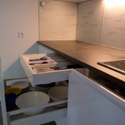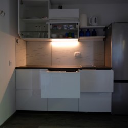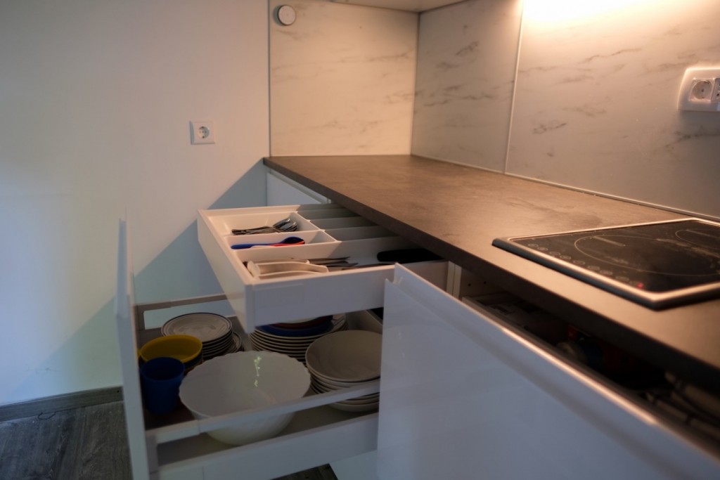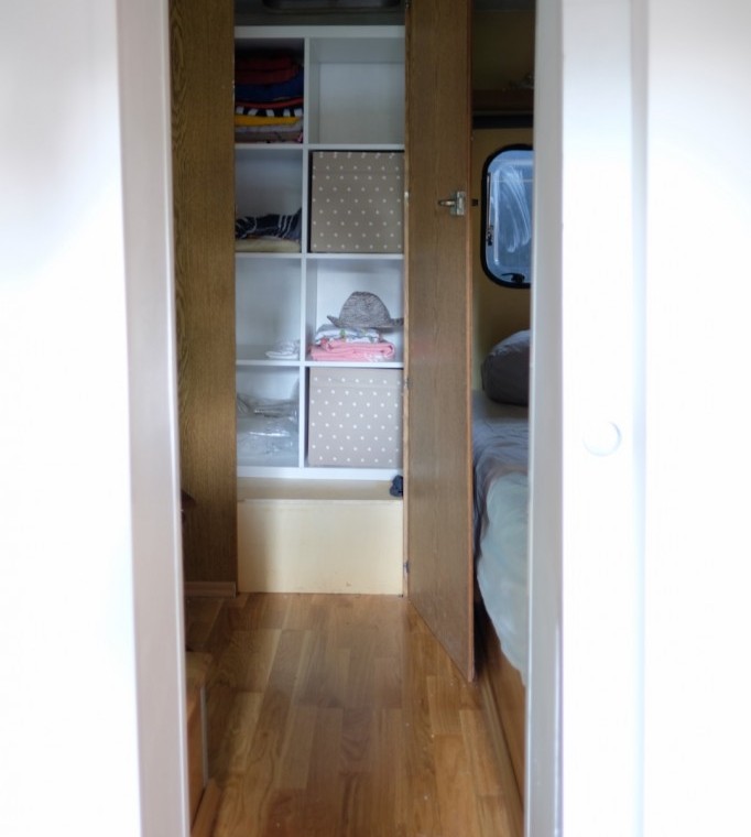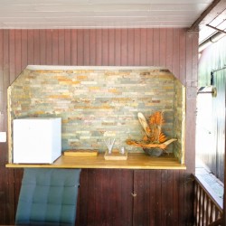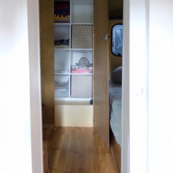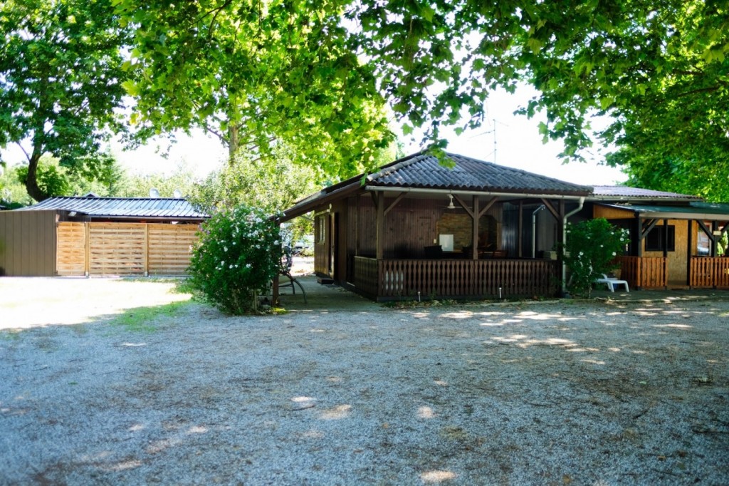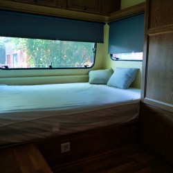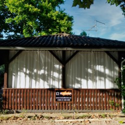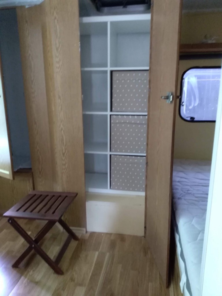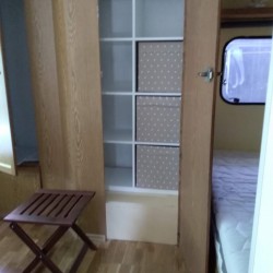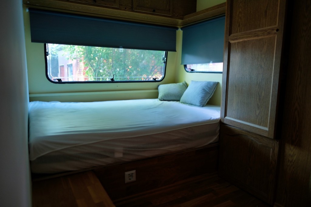 Adriina kamp prikolica je v naših rokah doživela velike spremembe. Okoli prikolice (kjer je spalni del za 4 osebe) je izdelana lesena brunarica, ki ima še 15m2 velik dnevni prostor s sedežno garnituro (dve dodatni ležišči) in popolnoma opremljeno kuhinjo s hladilnikom in zamrzovalno skrinjo.