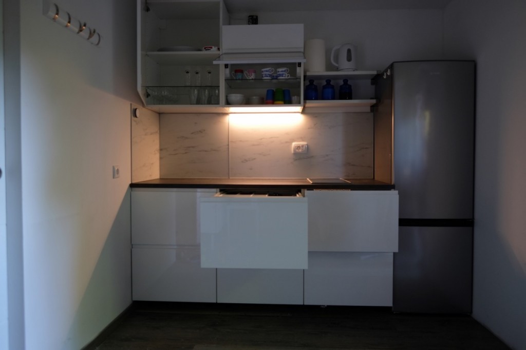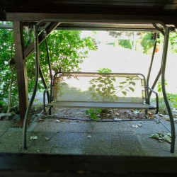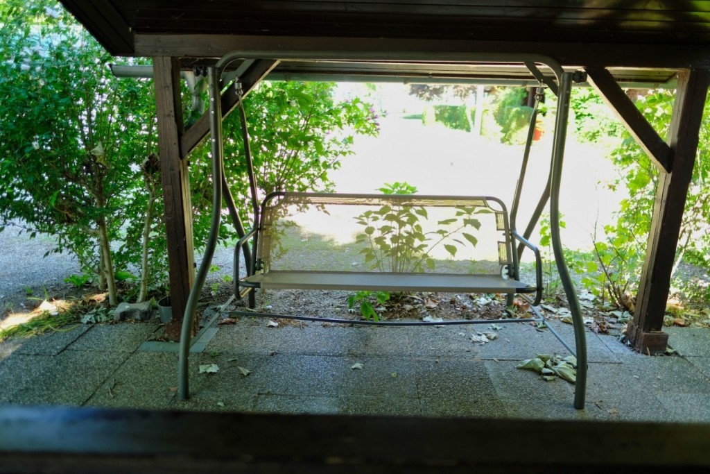 Zunaj je nadkrit prostor z gugalnikom, ter pokrito teraso, ki ima svoj dodatni hladilnik in urejeno hlajenje z ventilatorjem. Na terasi je razstegljiva miza s šestimi stoli, ki so primerni tudi za počivanje. Seveda je pripravljen tudi žar.