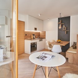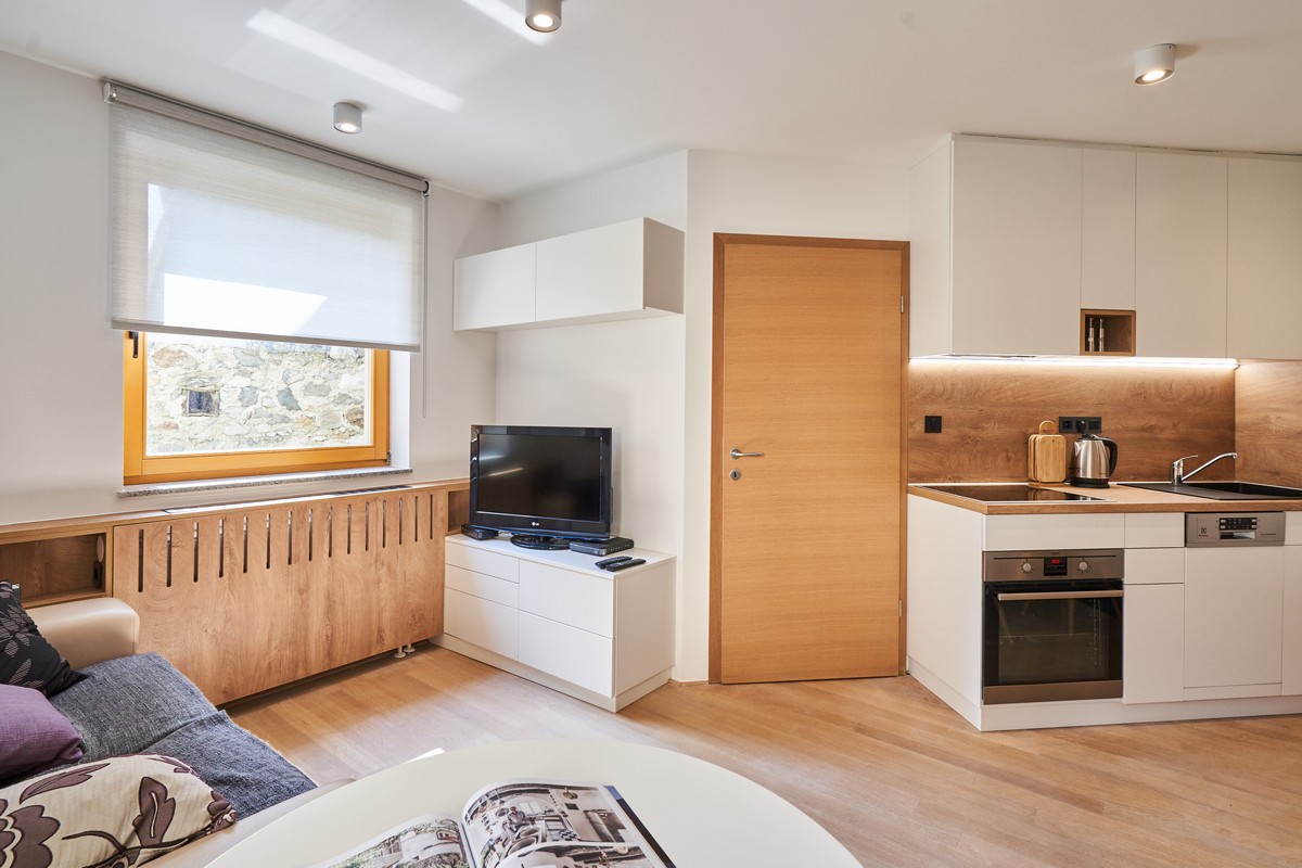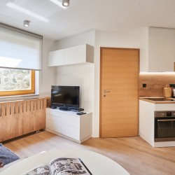 Gre za enosobno stanovanje, sodobno opremljeno v lesenih in belih tonih. Ima zaseben vhod, dobro opremljeno kuhinjo (indukcijski štedilnik, zamrzovalnik, pomivalni stroj) z jedilnico, štedilnikom in prijetno sedežno površino z veliko naravne svetlobe. Apartma se nahaja v pritličju, zelo prijazen je tudi za invalide in otroke, in meri 45 m2. Apartma ima veliko zakonsko posteljo in kavč, ki se zlahka pretvori v posteljo za dve osebi z velikostjo postelje 160 x 200 cm, kot tudi popolno kopalnico s tušem in straniščem. Vključuje tudi LCD TV, brisače in posteljnino. Na voljo je tudi shramba v kleti – za katero koli smučarsko ali kolesarsko opremo.