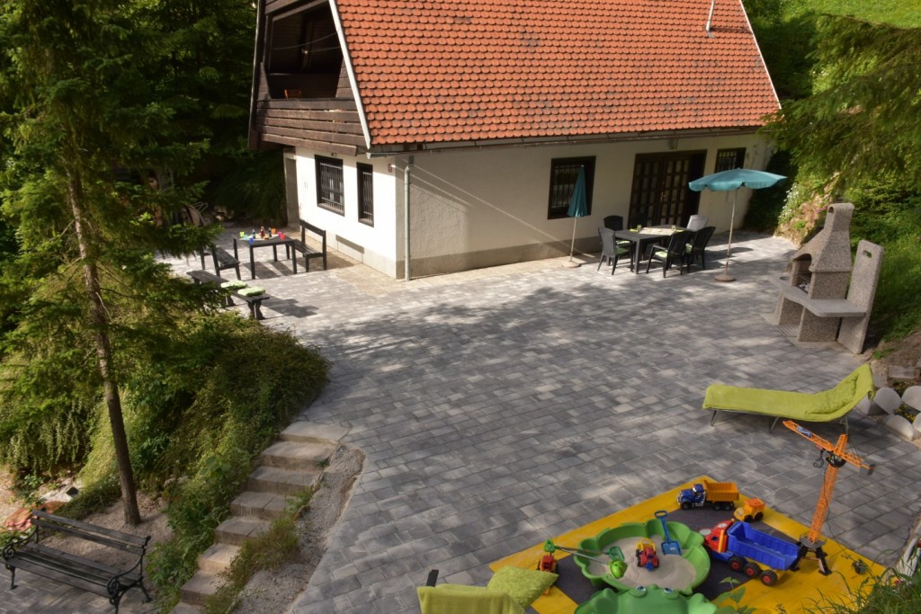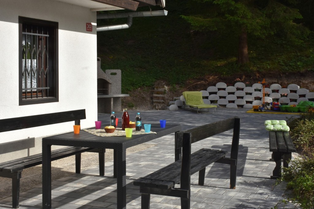 Pred hišo tlakovano dvorišče 200 kvadratnih metrov z mizami in stoli ter žarom.