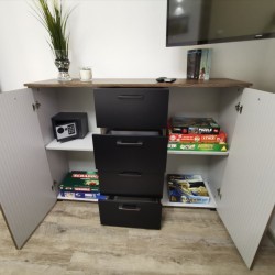 Pričakal vas bo s polno opremljeno kuhinjo, kopalnico, jedilnico, udobnim kavčem, dvema televizijema, talnim gretjem, pomivalnim in sušilnim strojem, svežo posteljnino in brisačami ter kaminom, ki pričara romantično vzdušje.