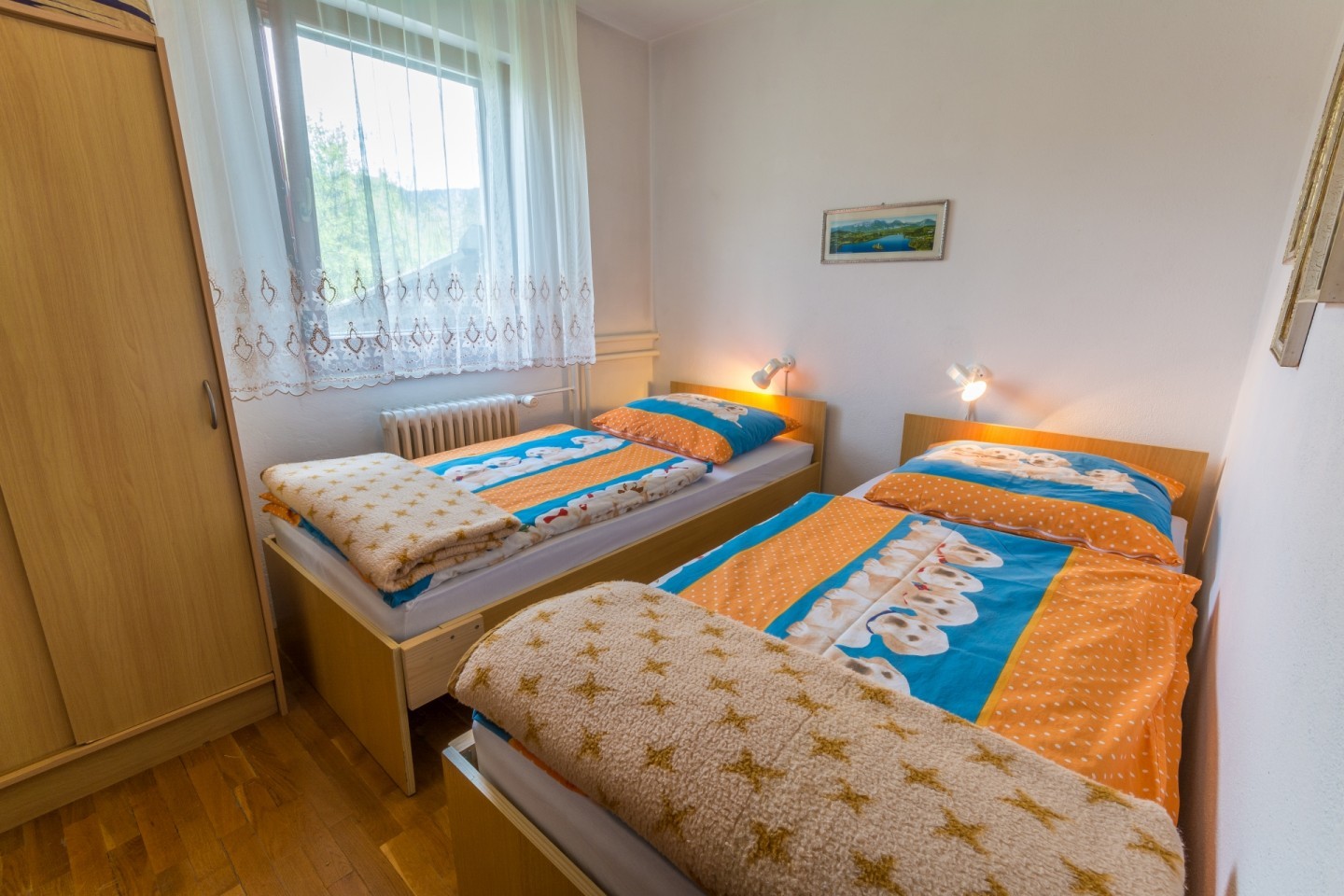 - 2 spalnici (ena z zakonsko posteljo, ena z dvema ločenim posteljama-otroška soba),