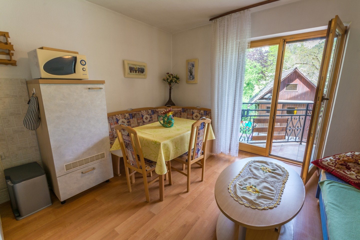 - kuhinja s popolno opremo (štedilnik, pečica, pomivalno korito, mikrovalovna pečica) z jedilnim kotom in sedežno garnituro,
