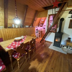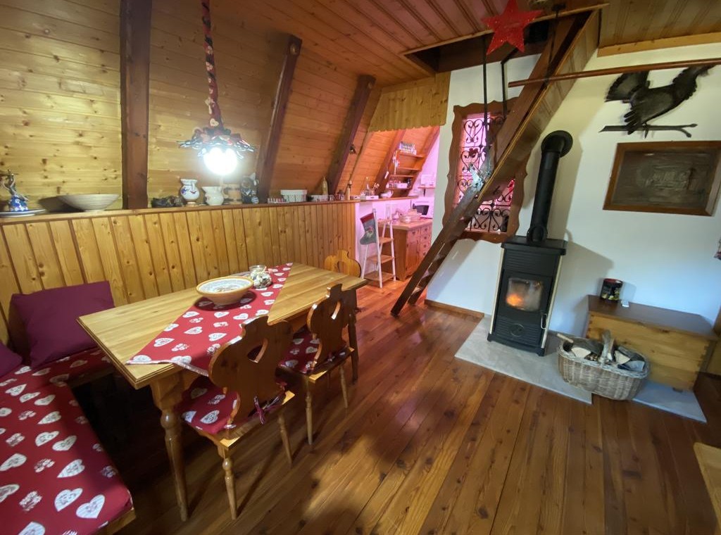 Ob vhodu je majhen hodnik, v glavnih prostorih pa kuhinja, jedilnica in dnevni prostor s kaminom. Kuhinja je opremljena s pečico, mikrovalovno pečico, opekačem, kuhinjsko tehtnico, rezalnikom salame, hladilnikom itd. Vsi naši gostje imajo dostop do vsega v hiši. Vse, kar najdete v kuhinji, je tam, da vam pomagajo do najbolj udobnih in popolnih počitnic.
